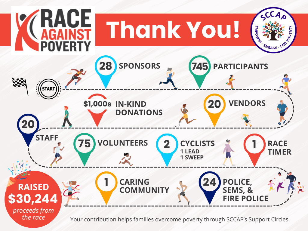 Funds raised from the race go directly to SCCAP’s Support Circles Program, which builds intentional relationships across economic lines, providing long-term support and accountability for families seeking to achieve financial stability.
