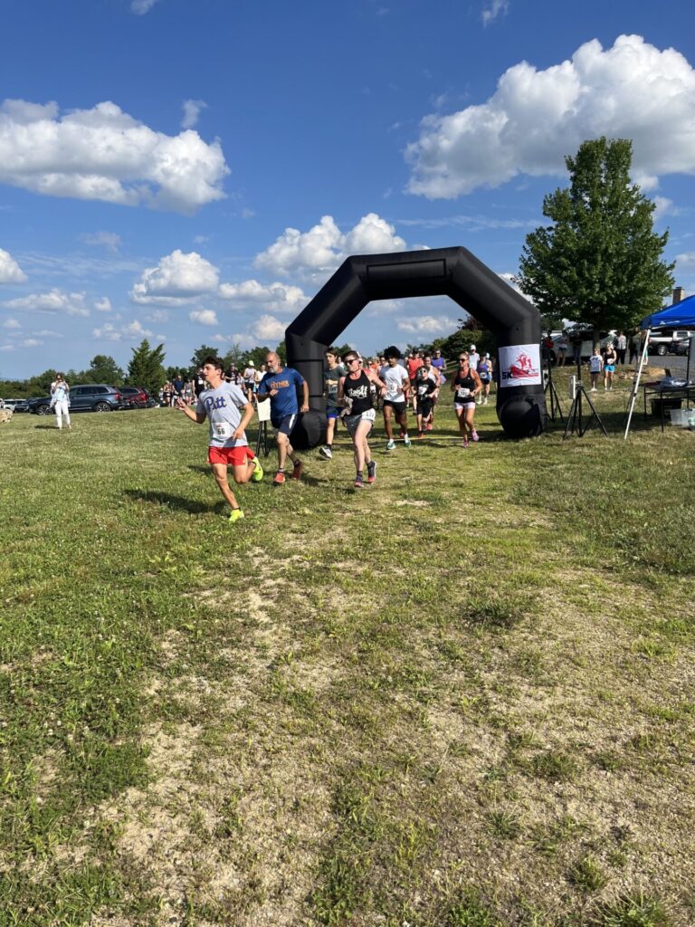CHAMBERSBURG– Chambersburg’s Ari Snyder, front left, leads the runners out of the gate at the Hauser Hill Wine Run 5K in Biglerville. Snyder won the race, defeating the field of 135 runners in 21:27.
