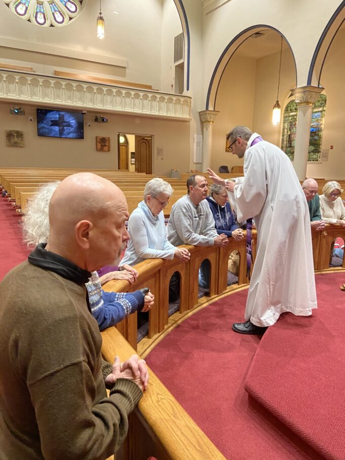 The Rev. Drahus Oslik, associate pastor of Evangelical Lutheran Church, Waynesboro, applies ashes to a person attending the Ash Wednesday Service Feb. 22...