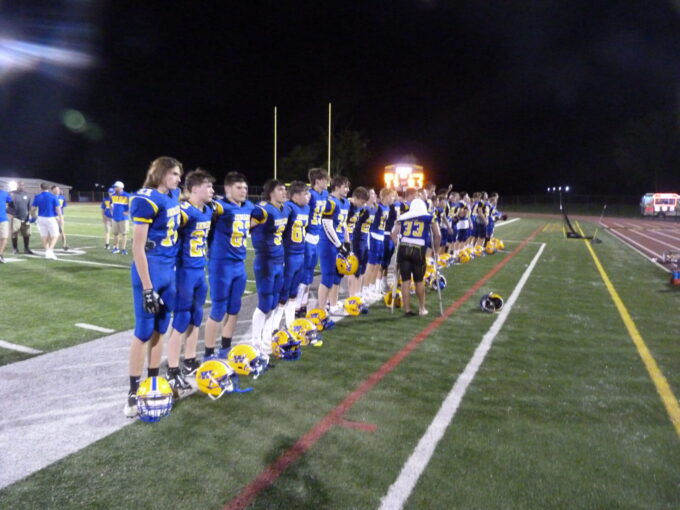 Waynesboro players line up to listen to the Waynesboro High School marching band's rendition of the school's alma mater song following Waynesboro's 21-3...