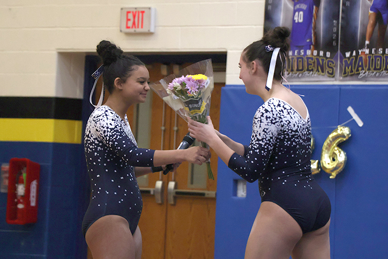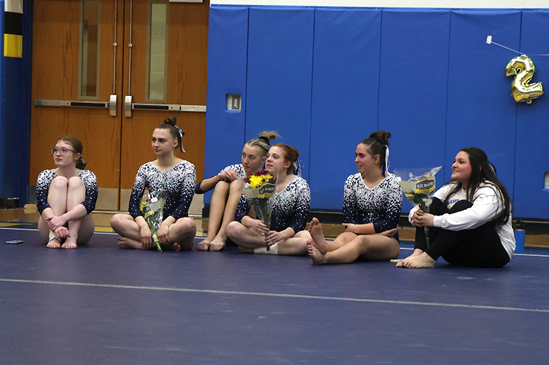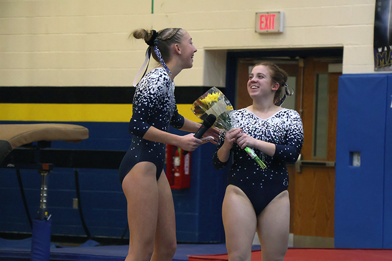 Following competition, underclassmen honored the Maidens’ senior gymnasts with flowers and words of appreciation. The team shared memories of fun times, friendships, and moments they said they will miss as the seniors prepare to graduate.