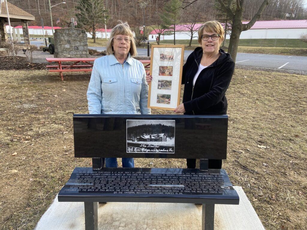 ROUZERVILLE–Waynesboro area sisters Pat Edwards and Barb Smith have preserved a piece of local history with the placement of a granite bench at Red Run Park to honor a family gift. The history of the property is inscribed on the seat of the bench.