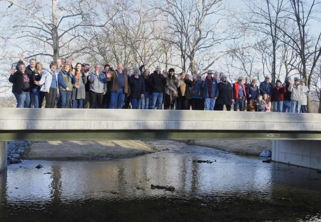 The bridge was engineered by Logan Swartz of C.S. Davidson Engineering, headquartered in York with offices in Gettysburg, and built by Kinsley Construction, headquartered in York, with offices in Hagerstown. SGI (Speciality Granules Inc.) of Blue Ridge Summit “made a significant contribution of donated stone and Triad Engineering, Hagerstown, provided geo-technical support with a partial discount,” according to Holliday. R. Lee Royer & Associates of Waynesboro performed civil engineering and Department of Environmental Protection permit applications.