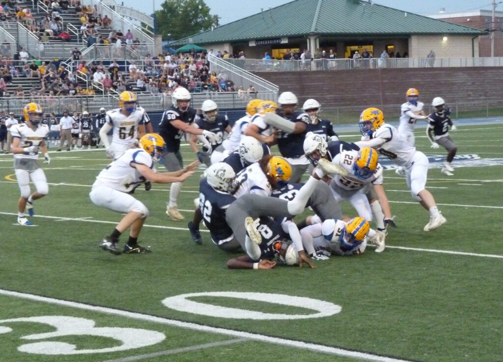 Plenty of time for some fireworks and a renewed sense of possibilities for a young Waynesboro team. Six seconds remained in the first half when Chambersburg lined up for a field goal attempt. But Waynesboro’s Andrew Florek broke through the line and blocked the field goal. A Waynesboro and Chambersburg player struggled to control the loose ball. Then, Shifflett scooped up the rolling ball and scampered around 50 yards for the touchdown that made it 20-13 at the half.