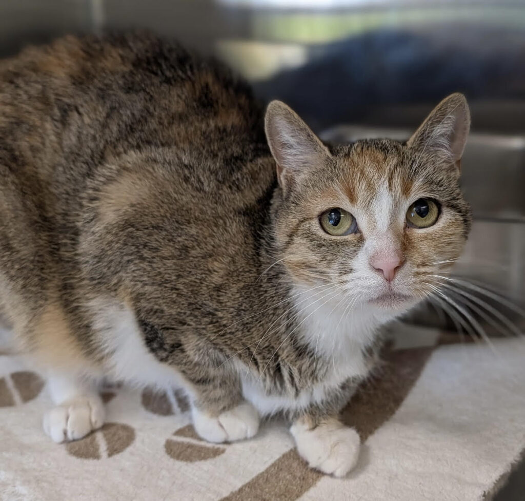 JoJo is a 2-year-old tabby girl with orange, brown and white coloring who is super nice. She came into the shelter as a stray and just wants to be near people. JoJo would love to know what a forever home is about! Could you show her?