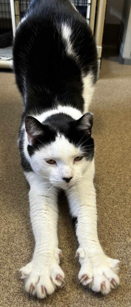 Look at that big stretch from Snowman! This 2-year-old black and white boy is super sweet and would love to get his second chance. Could you give him one?