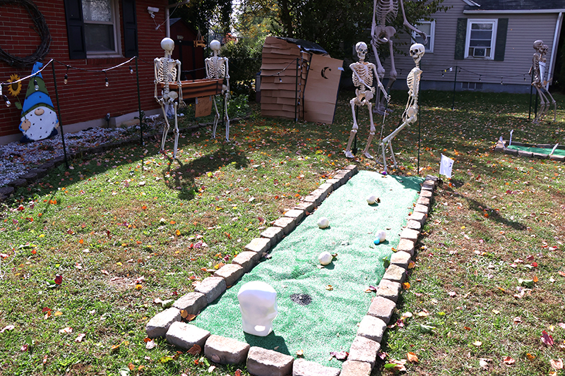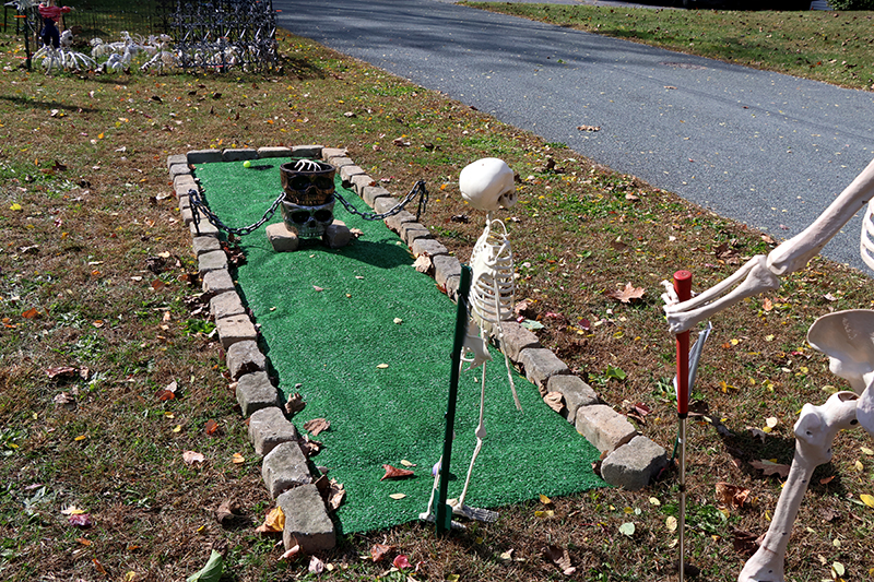 Past displays have included a carnival midway, a football game, a baseball matchup billed as “Shirts vs. Bones,” the chaotic “Dead Man’s Dash Aftermath,” a backyard picnic, an obstacle course, yoga poses and a nail salon. They’ve even recreated ’90s TV sitcoms such as “Boy Meets World,” “Step by Step” and “Full House.” This weekend’s attraction: a miniature golf course lined with skeletal players.