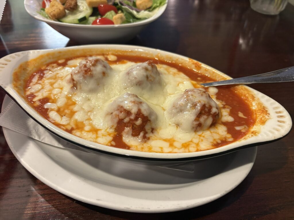 I started off my meal with an order of meatballs covered in mozzarella cheese in their signature marinara sauce. This came with a side of fresh Italian bread which was perfect for dipping and covering with the extra cheese. Not the most carb-friendly starter, but it was delicious.