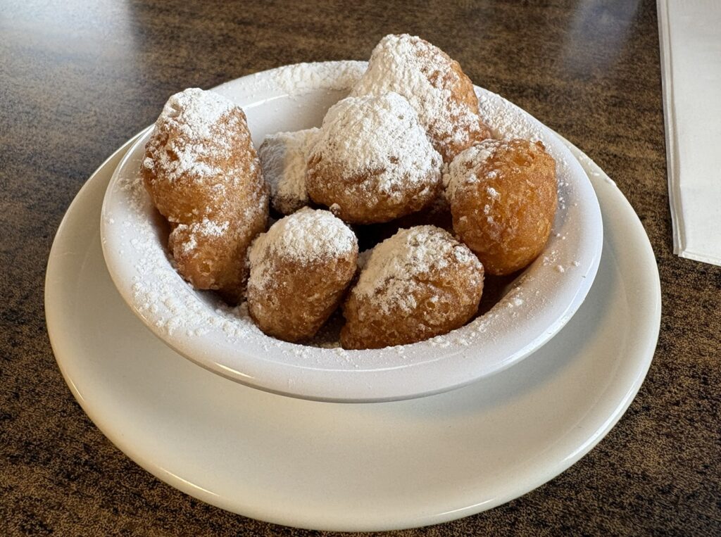 I started my meal with an order of corn fritters sprinkled with powdered sugar. I tried corn fritters for the first time not long ago, and they are quickly becoming one of my favorite cheat snack foods. For my side, I went with buttered corn, because it is another one of my favorites, and with the fritters and my lunch selection, I didn’t want to do any starchy sides.