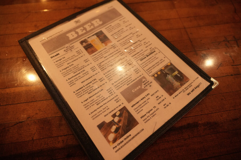 Huddled around a high top table with Fidgety, a hazy double, we learned how Wes names and creates the beer, how Casey keeps the gears turning online and at the bar, and how Nathan picks fresh herbs for the kitchen. It is apparent that they enjoy working together, and their passion is contagious. We visited on Thursday, which is Members Night, The Roughians! Pausing for hugs, handshakes and quick conversation with members, it was obvious that Casey and Wes have kindled a genuine family feel at Rough Edges. Many Roughians have become close friends due to attending Members Night regularly. Looking down the bar at the smiles and laughter, you can see 10 rotating taps and if you’re a fan of sours, then you’ve found seventh heaven! If Wes is craving a sweet, then it’s going in there! Rough Edges also serves a selection of Pennsylvania wines and ciders, and an assortment of non-alcoholic options. With trends ever-changing, Casey has everyone covered with her “to die for” cocktails!