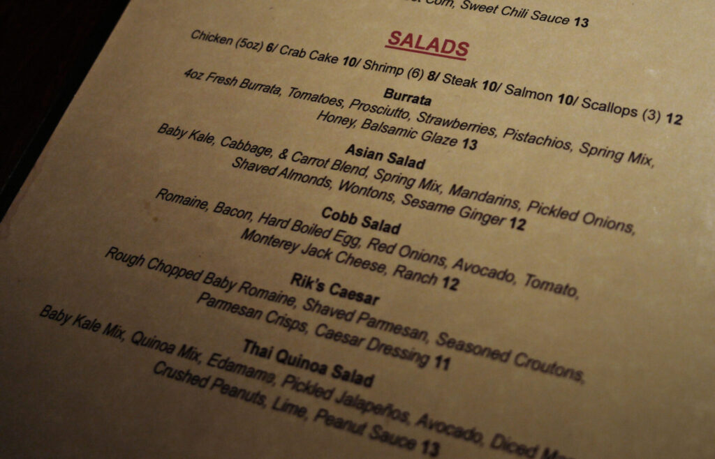 Starting off, we ordered a much deserving beer from their list of rotating taps. Gazing toward the bar, I could see an array of seasonal cocktails being prepared and a fine selection of alcohol and wines. For work, business or date night, Rik’s can accommodate your next outing.