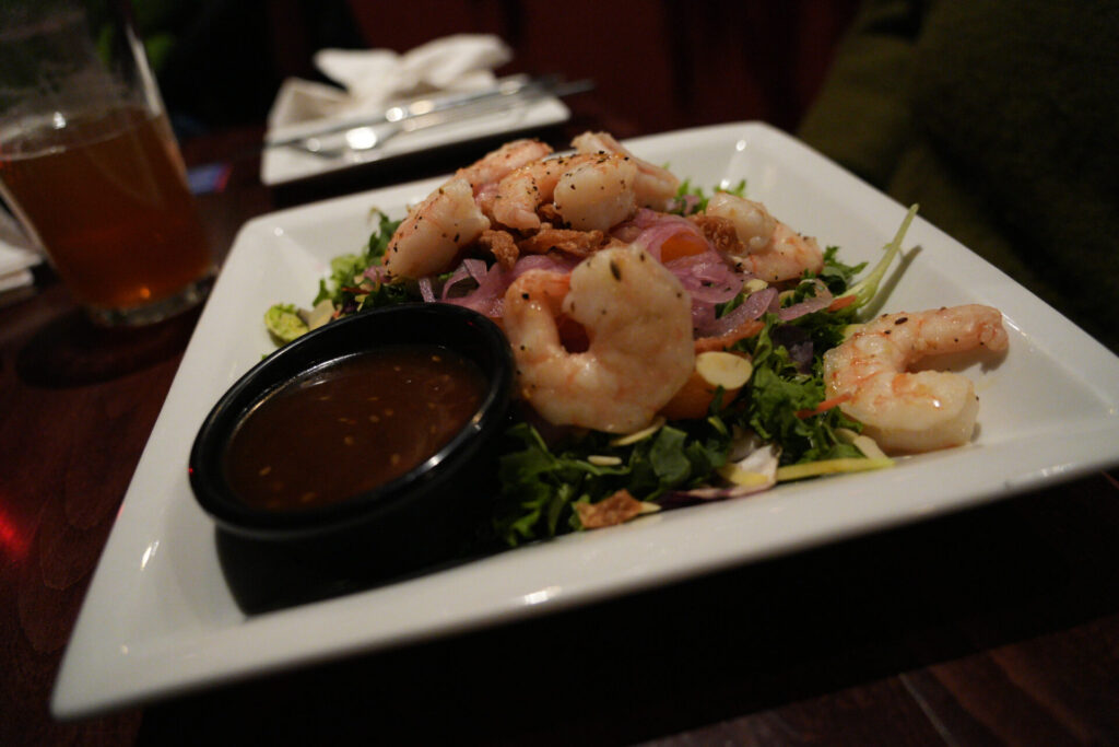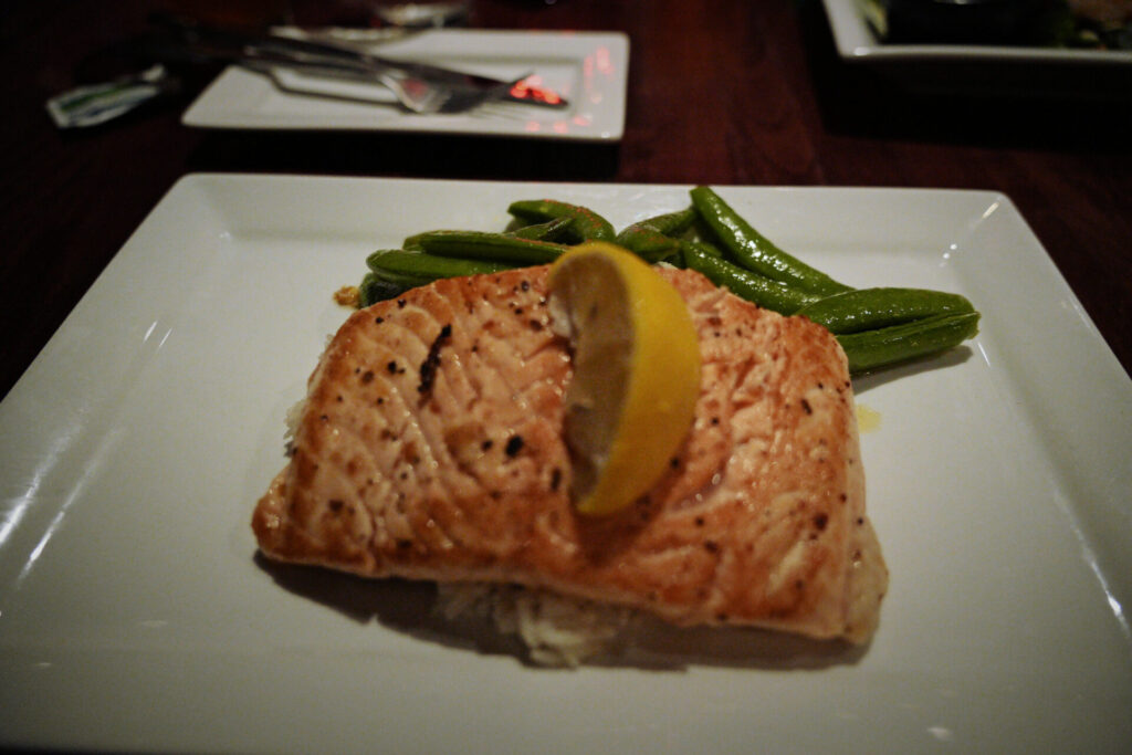 Did I mention the great service? This is something Rik’s can be proud of and a thing my wife and I respect. We then moved on to our entrees. I enjoyed medium rare salmon, served over sticky rice, a side of green beans, and a lemon garnish. My wife, Kate, devoured her favorite, the Asian salad with shrimp. This salad consisted of baby kale, cabbage, carrot blend spring mix, mandarins and pickled onions.