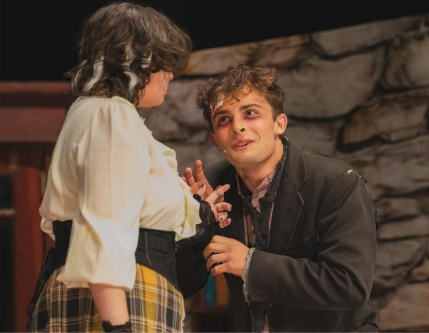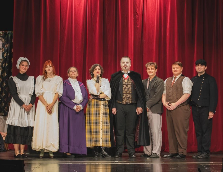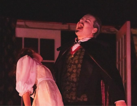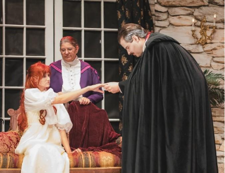 CHAMBERSBURG – Red lights illuminate the darkness, and a slow fog rolls across the stage. Eerie music echoes in the auditorium, and dogs bark and howl in the background. The sick and weak Lucy Seward lies on the couch within the gothic stone walls of Seward Sanitarium. A handsomely dressed figure emerges from the shadows and stalks towards the unsuspecting girl. This is one of the bone-chilling scenes that audiences experience when they see Chambersburg Community Theatre’s “Dracula Live on Stage” at the Capitol Theatre on Main Street.