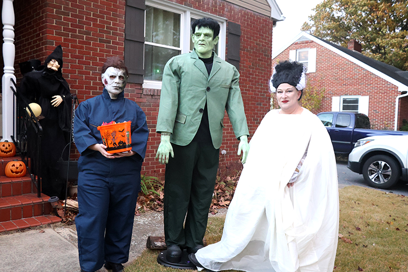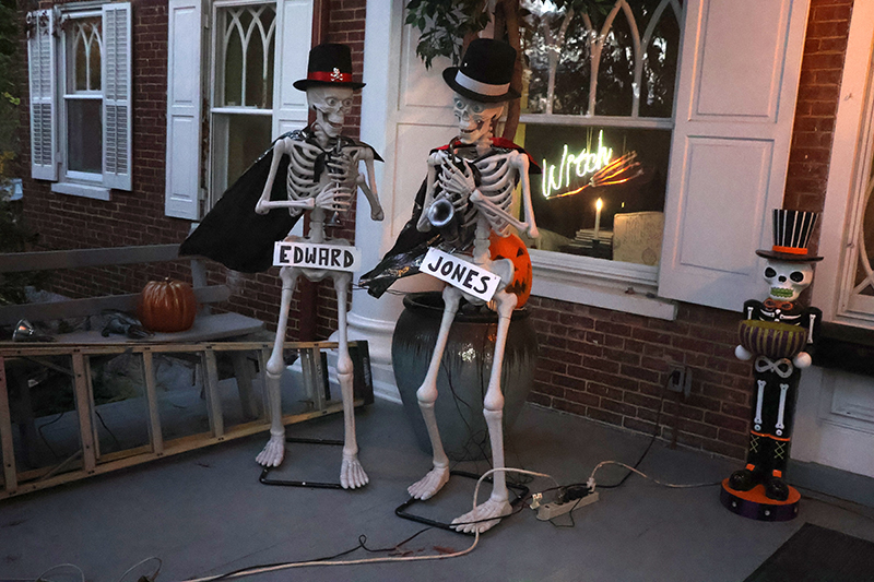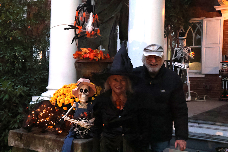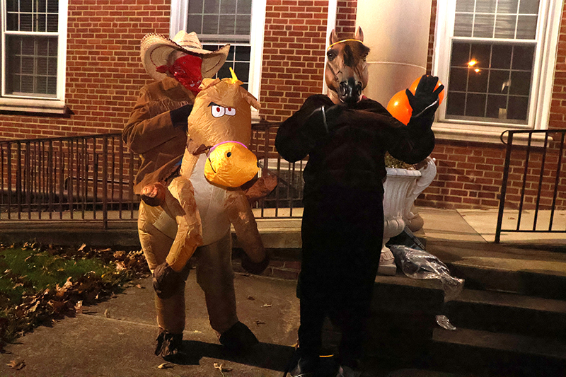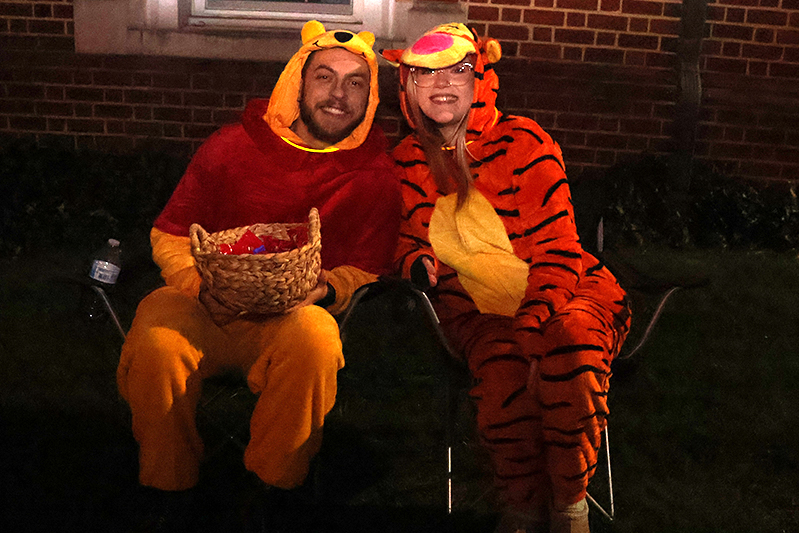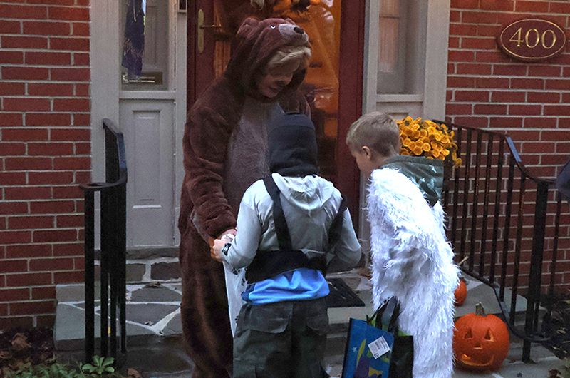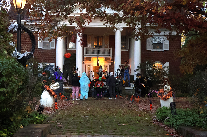Dozens of families bundled against the wind made their way along the historic thoroughfare, where porch lights glowed amid an array of jack-o’-lanterns, cobweb-draped facades and animated mechanical decorations that startled passersby. Residents in elaborate costumes — from witches and superheroes to friendly ghosts — greeted the crowds with handfuls of candy, transforming quiet homes into festive outposts.