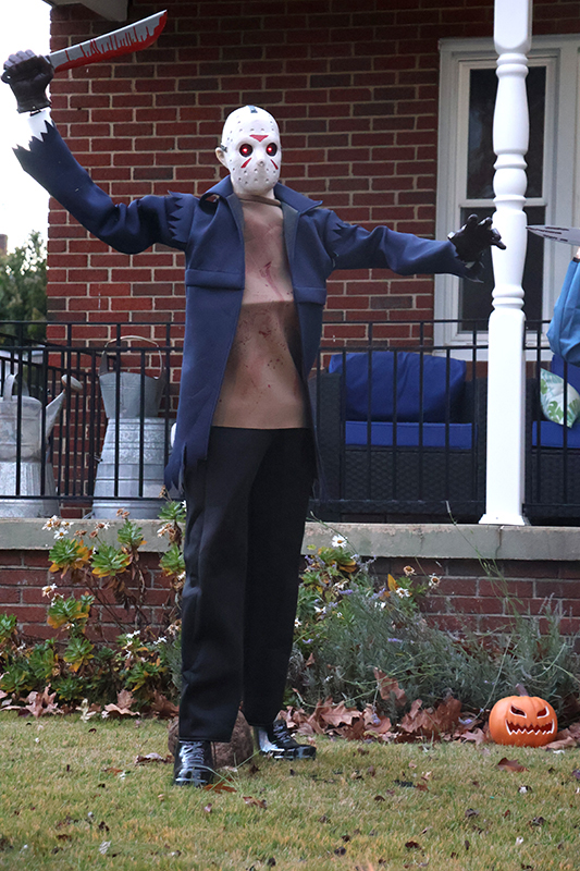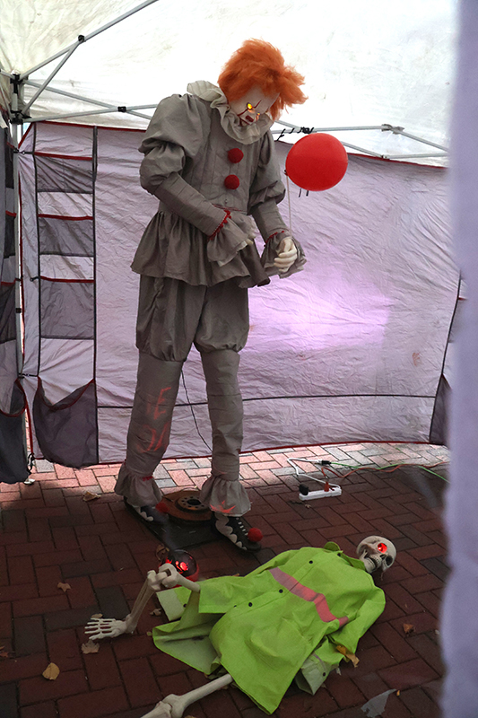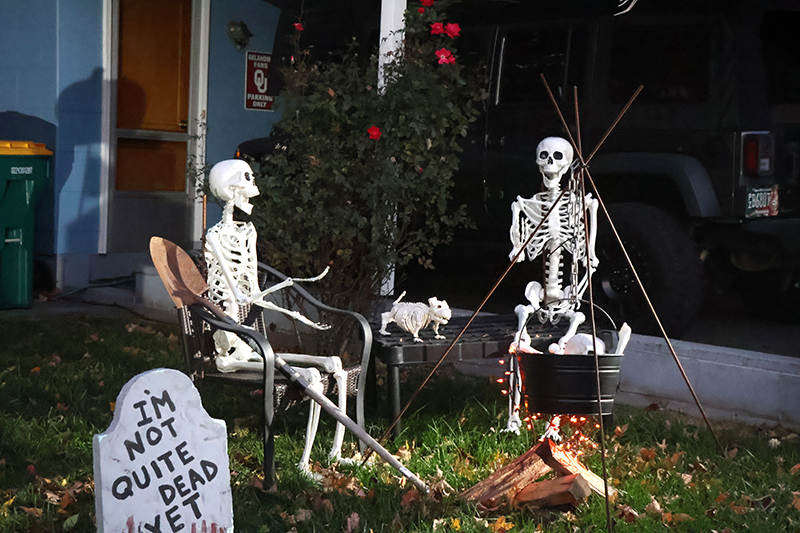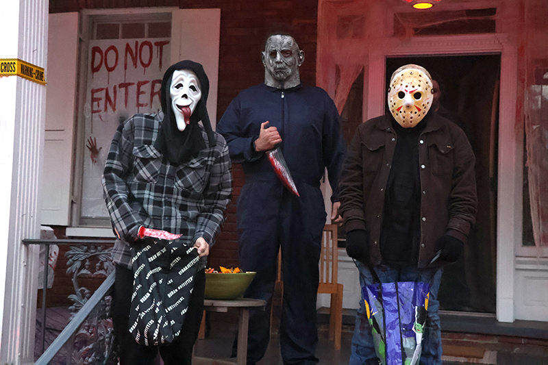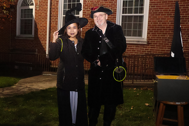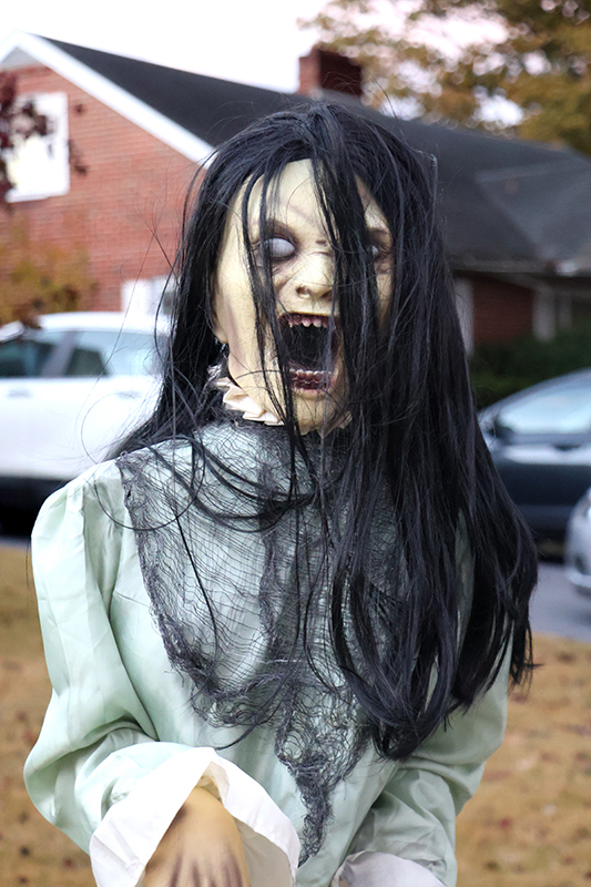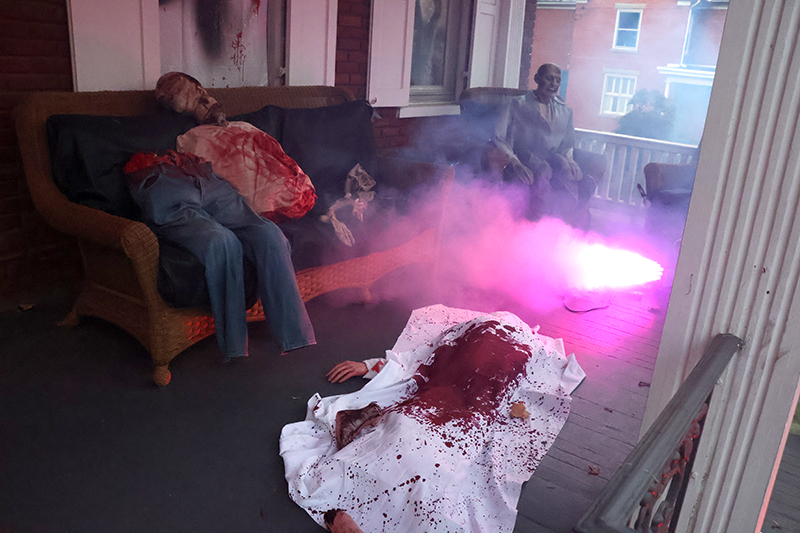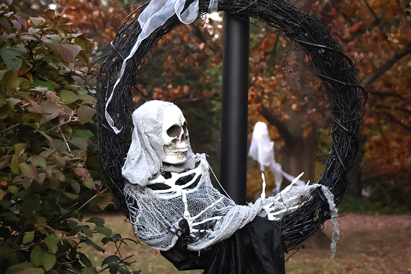 Dozens of families bundled against the wind made their way along the historic thoroughfare, where porch lights glowed amid an array of jack-o’-lanterns, cobweb-draped facades and animated mechanical decorations that startled passersby. Residents in elaborate costumes — from witches and superheroes to friendly ghosts — greeted the crowds with handfuls of candy, transforming quiet homes into festive outposts.