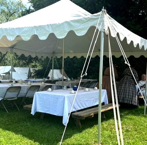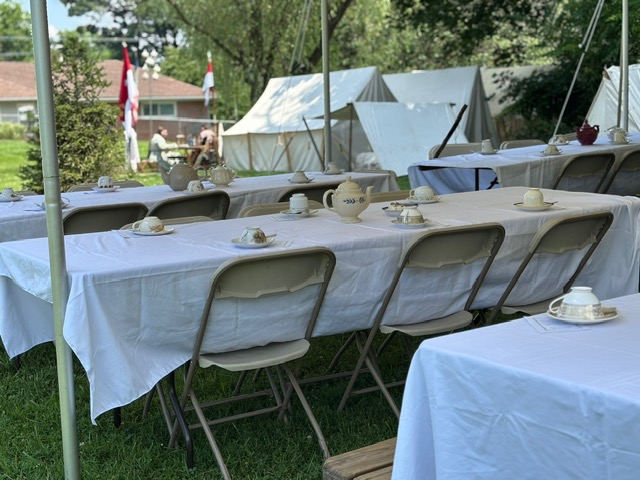 On Saturday, tables were set with antique cups, plates, flatware, along with home prepared, wedding-inspired indulgences like salad sandwiches in preparation for an era-inspired fashion show and tea party. In speaking to the re-enactors setting up the tea party, the passion held for this work is tangible, and many demonstrate their fondness for this lifestyle. With crinoline dresses flowing in the wind, these history lovers shared their passion for representing historical events.