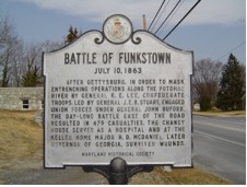 The Battle of Funkstown occurred on July 10, 1863, during the Gettysburg Campaign, the invasion of Pennsylvania by the Confederates. Confederate Maj. Gen. J.E.B. Stuart set up his calvary in a three-mile-long crescent-shaped lineup in Funkstown in order to prevent the Union from reaching Williamsport and the Potomac River and to allow the Confederates to continue their route to Virginia.