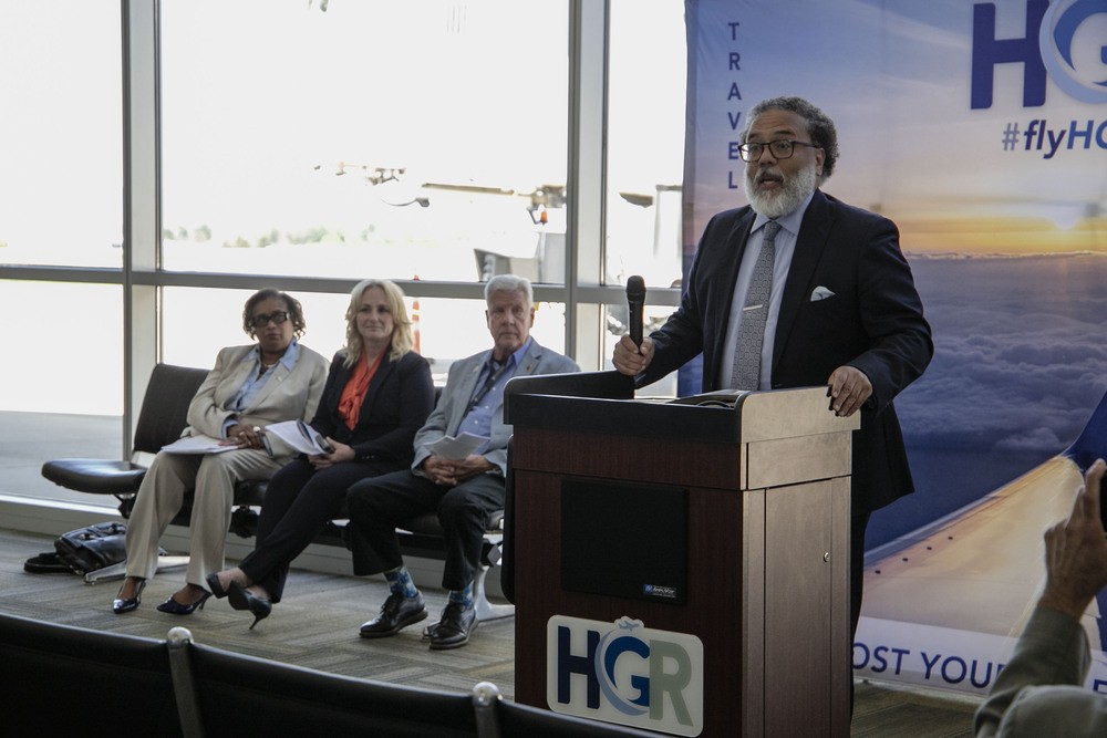 Pic 4 – Caption:  “Commerce Secretary Harry Coker, Jr delivering remarks.  Seated beside him are (from the left) are Maryland Aviation Administration Director Shannetta Griffin, Washington County Administrator Michelle Gordon, and County Commissioner and President John Barr.”