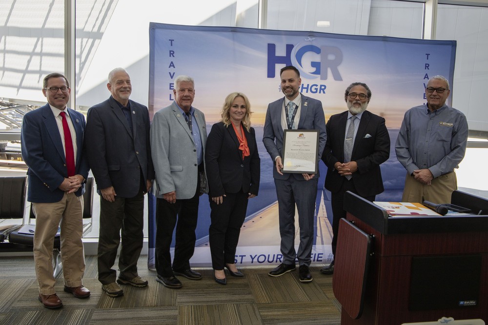 “Airport Manager Neil Doran receiving a Certificate of Recognition on behalf of his Airport Expansion Project Team from Washington County Chamber of Commerce President Paul Frey.  From the left, Carmen Fox of Ameriserv, Director of Business and Economic Development for Washington County Jonathan Horowitz, Neil Doran, Paul Frey, Dan Spedden of the Convention and Visitor’s Bureau, and Jim Kercheval, Greater Hagerstown Committee.”