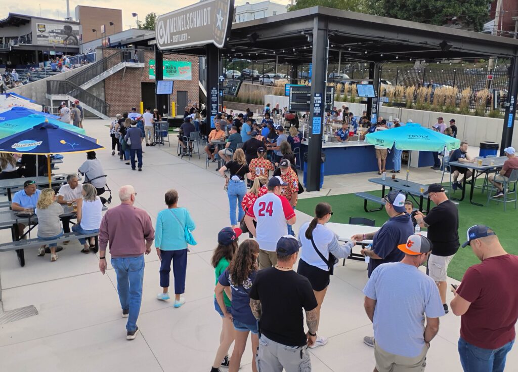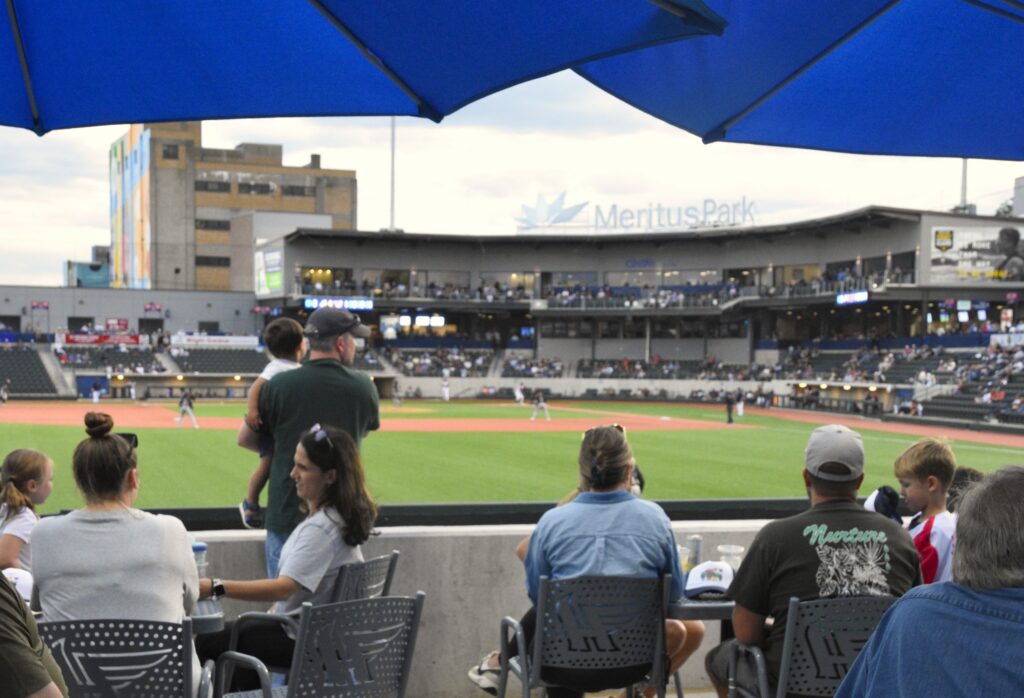 Beyond the leftfield fence, a private party snacked on picnic food and gathered under blue umbrellas on a large patio, watching the Boxcars battle the Barnstormers. Since Meritus Park is more intimate than a big-league ballpark, the crack of the bat and the cheering crowd are easily heard at this outfield section, which fans can reserve for a memorable group or family outing.
