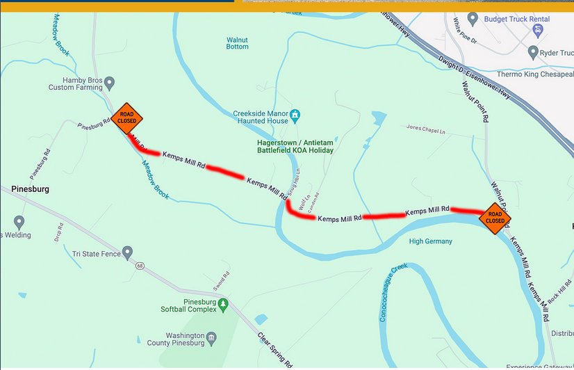 HAGERSTOWN, MD – The Washington County Highway Department announced it will be closing Kemps Mill Road at the Snug Harbor bridge for inspection on Wednesday, Nov. 29, between 9 a.m. and 2 p.m. This closure will take place between Pinesburg Rd and Walnut Point Rd.