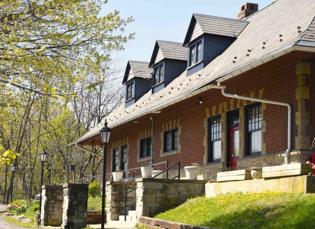 The station’s interior impresses with cream-colored brick tiles that present a striking contrast next to dark brown chestnut woodwork. At the north side of the main waiting room, bay windows offer a view of the tracks. Also inside were former spaces such as a ticket and telegraph office, a smoking parlor and baggage rooms. The building was steam-heated, and silvery radiators are still present.