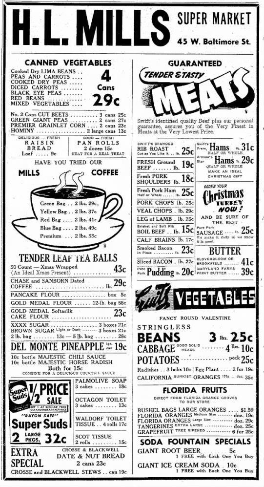 The 1920’s and ’30’s saw an influx of new grocery businesses pop up around the city in addition to Gordon’s Grocery. Just a year earlier in 1922, A & P Foods opened their first store on 124 W. Franklin St. and then opened a second store in 1929 on 600 N. Potomac St. before moving to 480 N. Potomac St. in 1935. Also in 1935, two more grocery stores joined the community. They were Pen Mar Foods which was located at 55 West Franklin Street and American Food Stores which sat at 120 W. Franklin St. One didn’t have to walk far on Franklin Street or Potomac Avenue to find a place to get their weekly groceries.