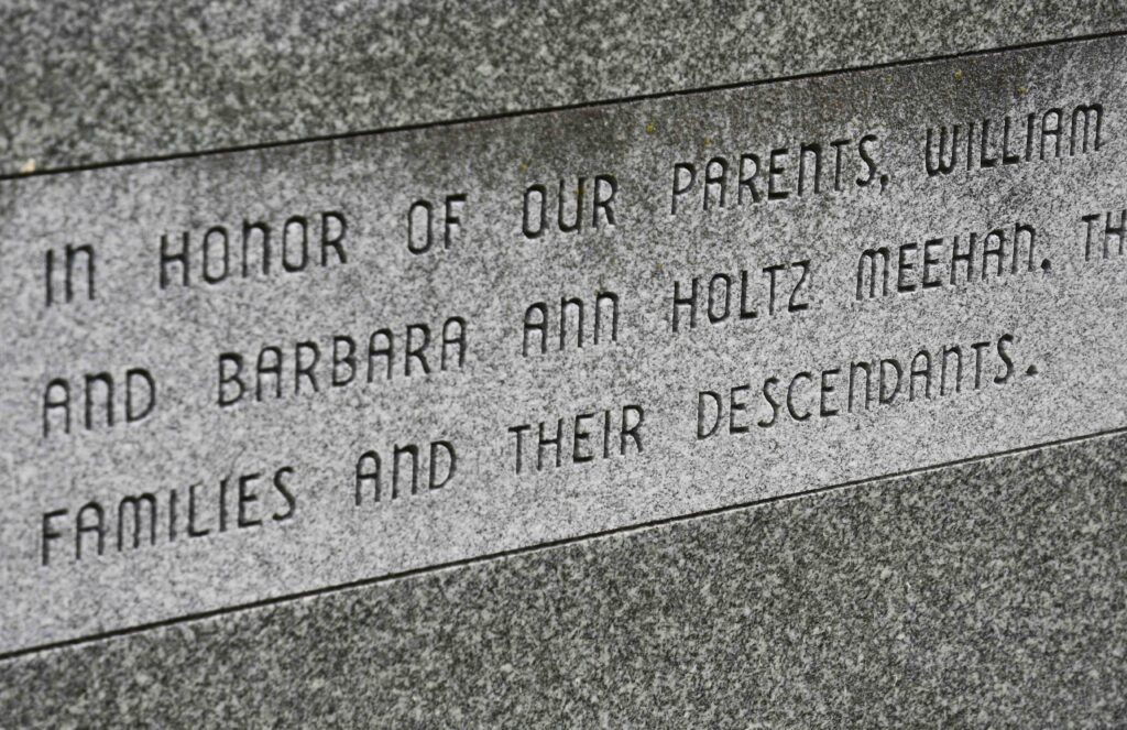 Three years later, a handsome 10-foot granite cross appeared in St. Andrew’s Cemetery, bequeathed by the departed Meehan siblings. Erected and dedicated in honor of their parents and serving as the official marker for the burial ground, this kind gesture showed how Mary, Clarence, and Carmel were devoted to their parents, their faith, and their community.
