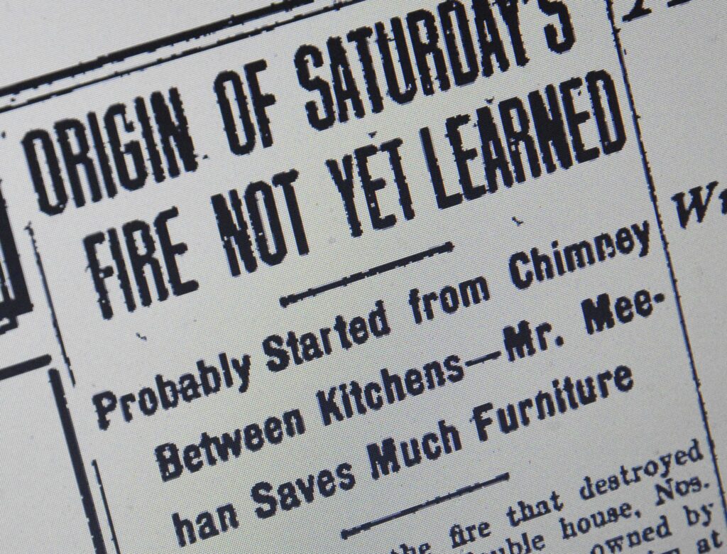 On February 3, 1912, the Meehans relaxed at home during a Saturday afternoon. The family that shared their double home on Fairview Avenue, the Martins, was also present inside the structure. Mrs. Martin, suffering from pneumonia, smelled smoke and discovered a fire that started in a chimney on their side’s kitchen. She alerted the Meehans, and as they awaited the fire department, William Meehan frantically hauled furniture and family belongings into the street.