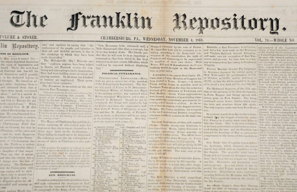 The Franklin Repository continued publishing until 1931 when it merged with Chambersburg’s Public Opinion newspaper, which is still in print today.