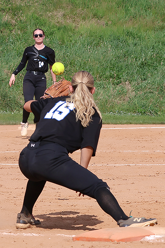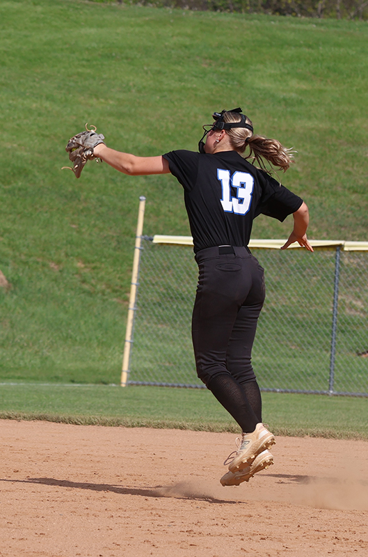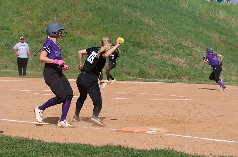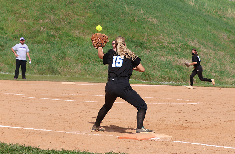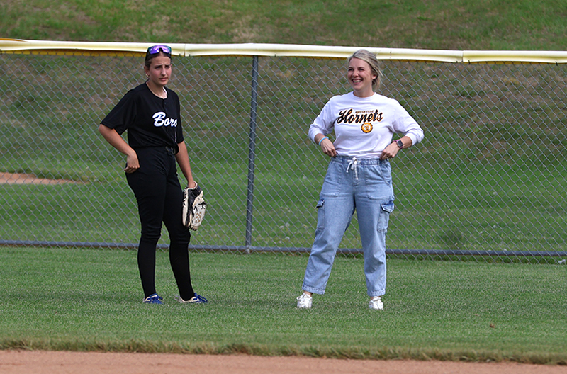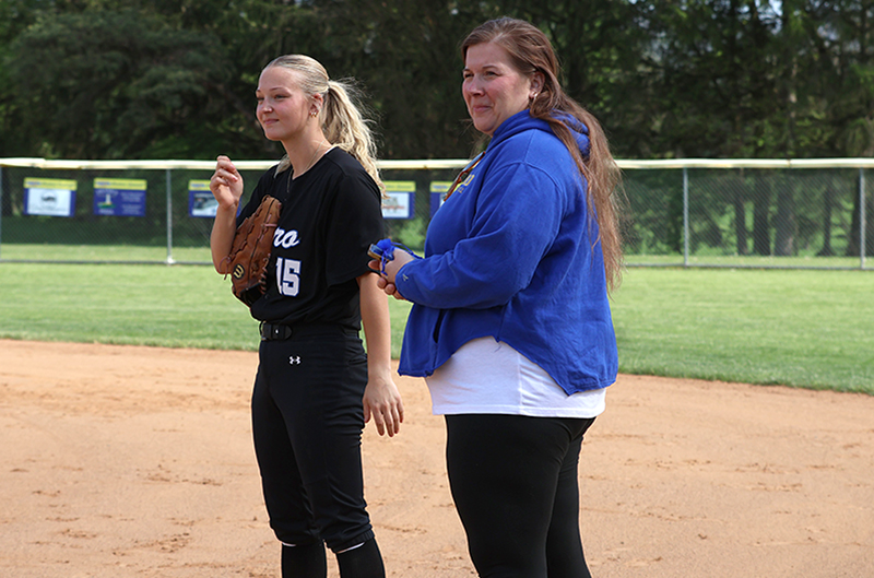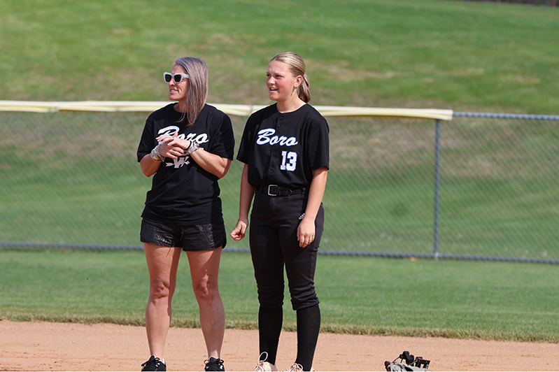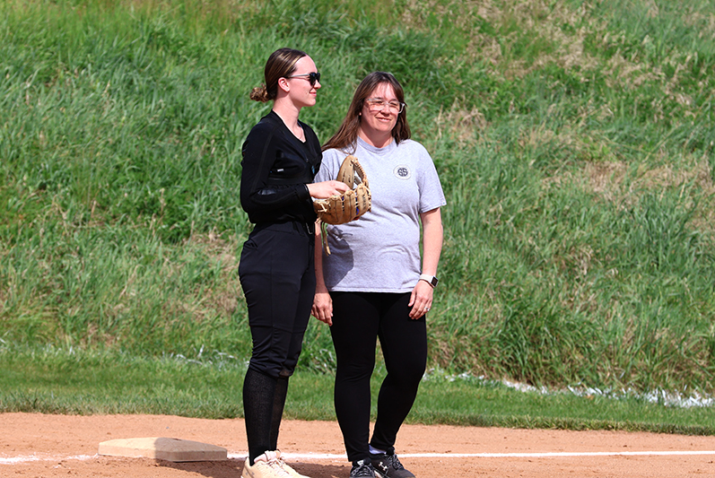 Emma Bradley (Class of 2027) started in the circle for the Maidens, with Lydia Shank (2026) behind the plate. Around the field, current players were paired with alumni, including Haley Reynolds (2026) at first base alongside Hannah Mummert (1998-2001), and Rylee Miller (2026) at third base with Stephanie Miller (1995-1996).