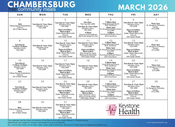 Keystone Health has released a calendar of free community meals available throughout Chambersburg for March, offering local residents hot meals at no cost at churches and nonprofits across the borough. The calendar, shared in English and Spanish, highlights a monthlong network of breakfasts, lunches and dinners designed to support neighbors facing food insecurity in Franklin County.