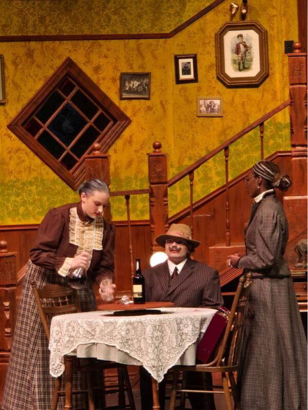 This black comedy centers on the Brewster family: Mortimer, a drama critic, played by Keagan Killinger with assertive cynicism, dapper and straight as the stripes on his buttoned grey suit. Mortimer is set to be married to Elaine Harper, sharply portrayed by Maddie Mamoudis, who appears in a fetching red dress and beret that seem to imply that, though she’s the reverend’s daughter, she is far from a church mouse and as wise as she is charming.