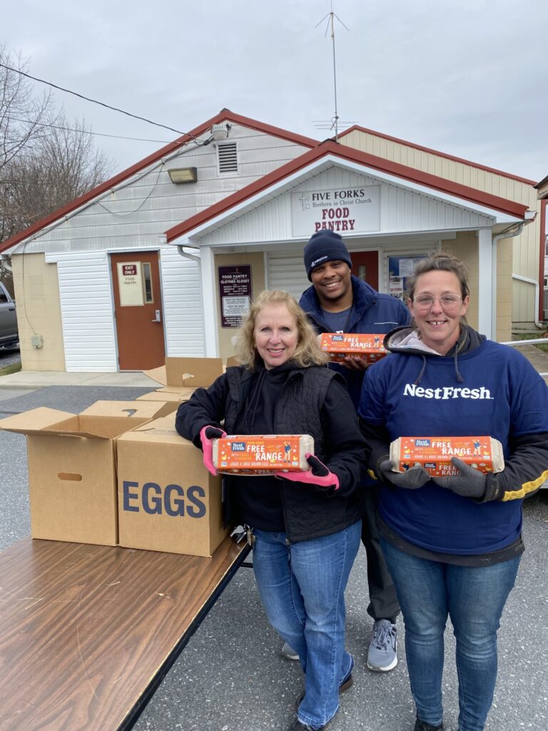 WAYNESBORO – Just in time for holiday baking and other needs, NestFresh of Chambersburg has donated 900 dozen free-range, organic eggs – yes, count ’em, 900 dozen – to the Five Forks Church Food Bank in Waynesboro.