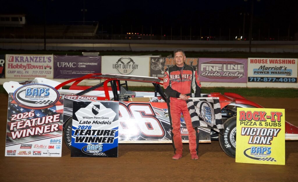 Photo courtesy of BAPS Motor Speedway Greencastle’s Scott Palmer celebrates from Victory Lane after winning the Limited Late Models feature at BAPS Motor Speedway.