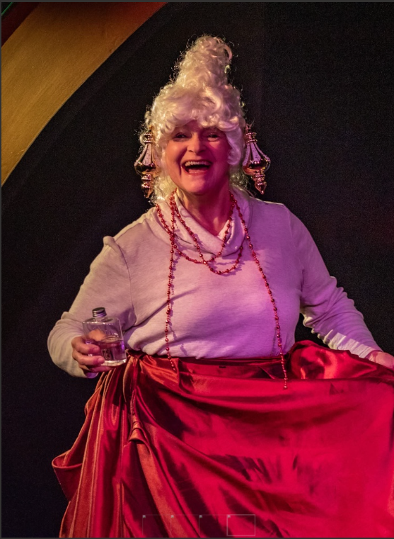 Lois Jarman toasts the room as Mrs. Fezziwig.