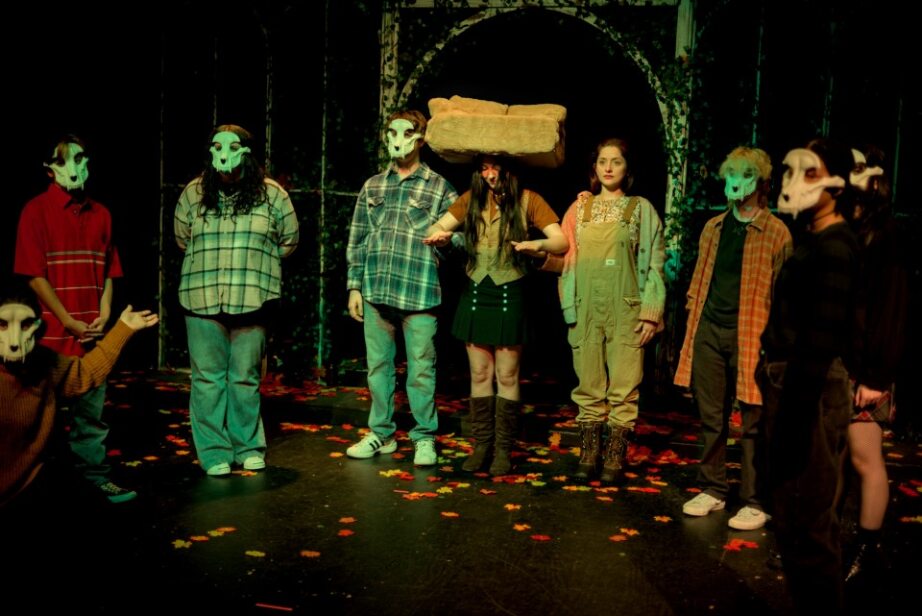 Costume design by Channing Tucker produces an ensemble of grunge flannel-clad teens, a goth girl in fishnets and combat boots, and a greenhouse in floral painted overalls. Tucker’s mask work ranges from the natural beauty of animals to grim skeletons, to the vines and florals of Greenhouse. Facing the unique challenge of having to build costume for a personified couch, Tucker and Costume Assistant Jack Dempsey rise to the occasion. The duo most remarkably creates the decomposing body of the dead girl, by transforming a body suit into a living corpse with peeling skin.