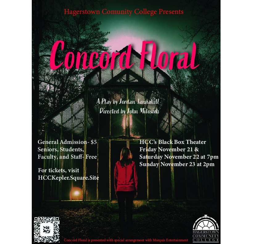 The Kepler Performing and Visual Arts Center Black Box Theater at Hagerstown Community College presents “Concord Floral,” written by Jordan Tannahill, with co-creators Erin Brubacher and Cara Spooner. The show’s limited Nov. 21-23 run closes Sunday, Nov. 23, at 2 p.m.