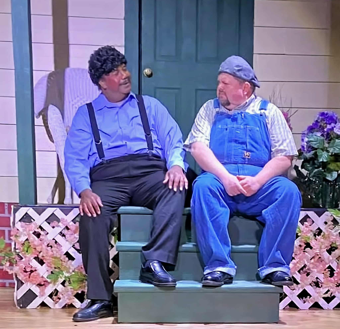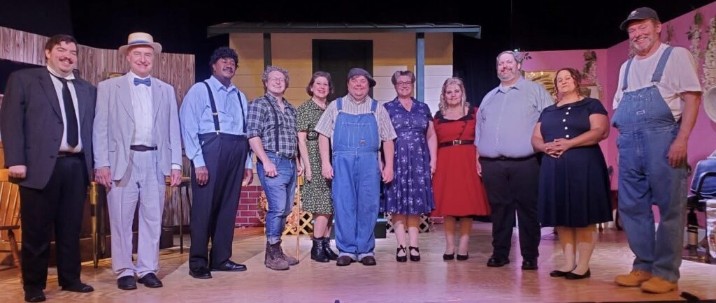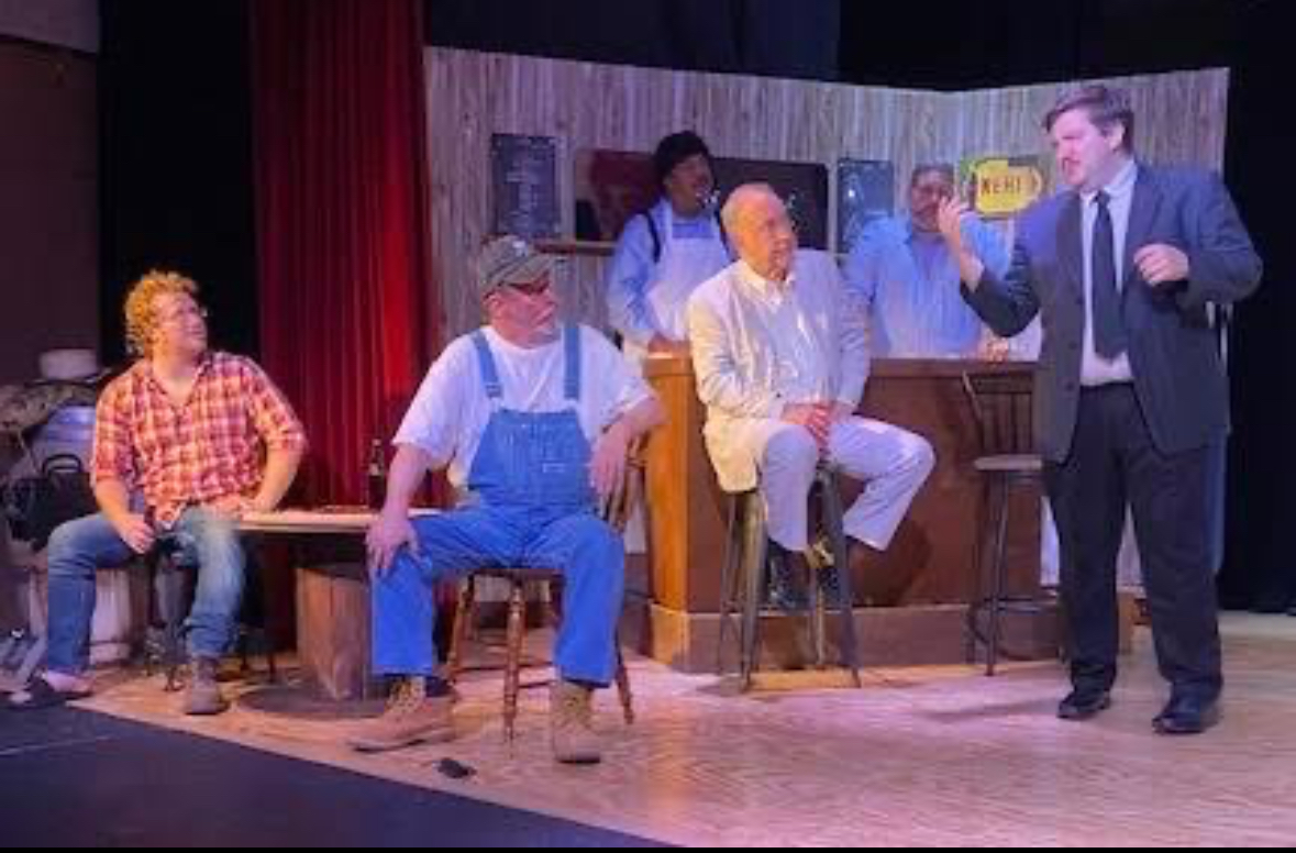 The humor of the Bait and Brew crowd earns every laugh. Mark Perman, clad in a seersucker suit as Doc, is reminiscent of a beloved Mayberry character, standing at the crossroads where folksy charm and integrity meet. Dylan Rinker is the height of humor as Mansel, a World War II vet insistent that his disappearance from the war was due to Nazis kidnapping him and eventually returning him by submarine to the sands of Myrtle Beach. Dan Ritchey, as Bait and Brew owner, Frisky, takes a stand for colorblind loyalty to US, all the while playfully dodging every phone call from his wife. In his debut performance with Potomac Playmakers, Dalton Korrell brightly portrays June, the town funeral director, peppering hilarity in the darkest places.