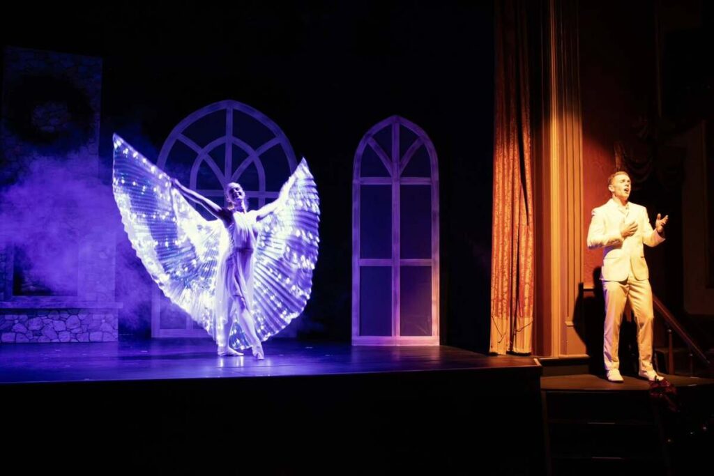 Joel Musser smartly plays Jimmy, an angel in disguise who has been assigned by Father God as a maintenance man at a church. Jimmy impactfully opens with the disclosure of his angel status and a song that sets the tone for God’s heart through Jimmy’s assignment: to bring out of the shadow of Christmas chaos His design for humans to hope, believe and trust. Terra Musser elegantly emphasizes God’s message through movement as she worshipfully dances behind Jimmy.