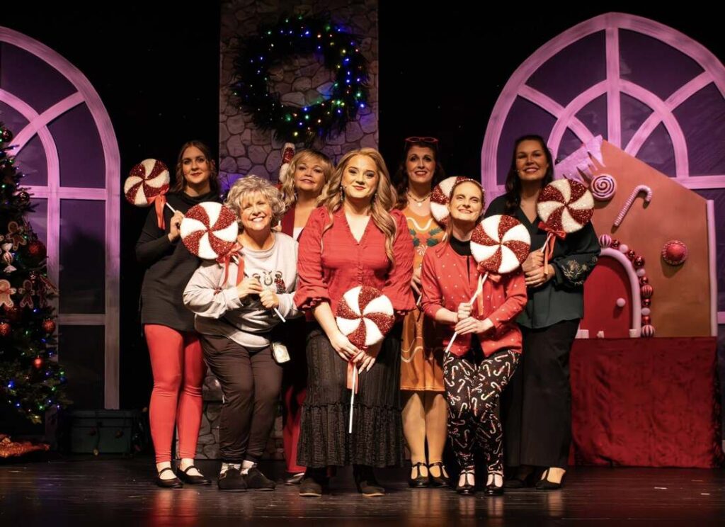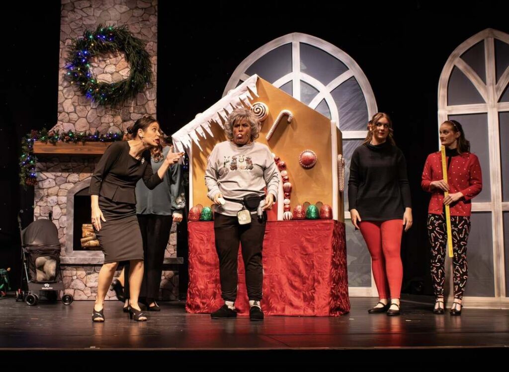 Like every church, the one to which Jimmy has been assigned is staffed and attended by humans who are quite gifted at the art of being human. Some of their choices and decisions are affecting, if not wreaking havoc in, the lives of one another. During a gathering of the committee tasked with decorating a gingerbread house for a competition, the messy circumstances and quirky personalities of key congregants shine through. Sarah-Lynn Styers is certain in leadership performance and focused on winning the competition as Sue, the head of the committee. Kasey Schaub is seeped in entitlement and opinions as the bold Dottie Gotrocks. Cathi Musser endearingly brings to life Nanny Biscuits who has a heart as big as an overloaded animal shelter and traits that require leaning heavily into the grace of Jesus. Brooke Helfrick is desperately hopeful as Emma who longs for what seems to be a much delayed engagement to Kevin. Hope Fleece is sympathetically distrusting and heartsick as Sophia, wife of the pastor. Brittany Parson and Faithe Shank round out the decorating committee as Meg and Pamela whose perfectly timed quips of heart and sarcasm add layers to the complex group of church ladies.
