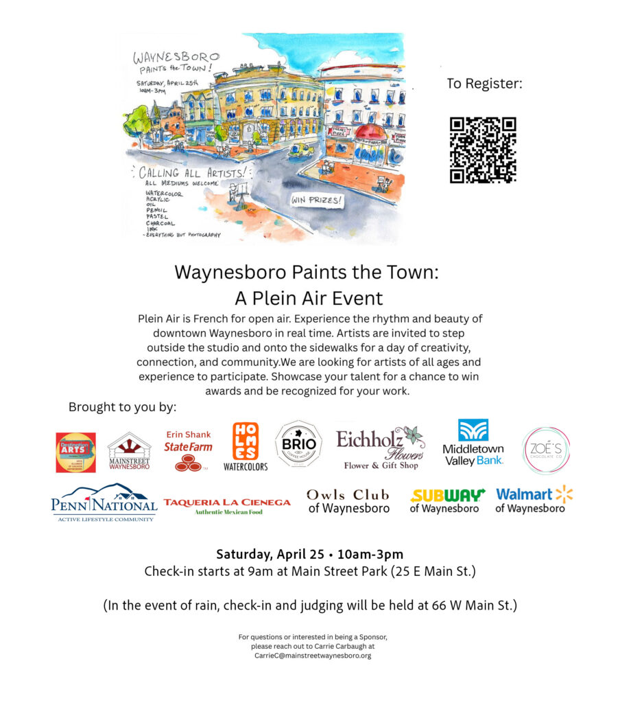 WAYNESBORO, Pa. – Local artists will venture outside the four walls of a studio as they participate in Waynesboro’s first plein (open) air event in Waynesboro from 10 a.m. to 3 p.m. Saturday, April 25.