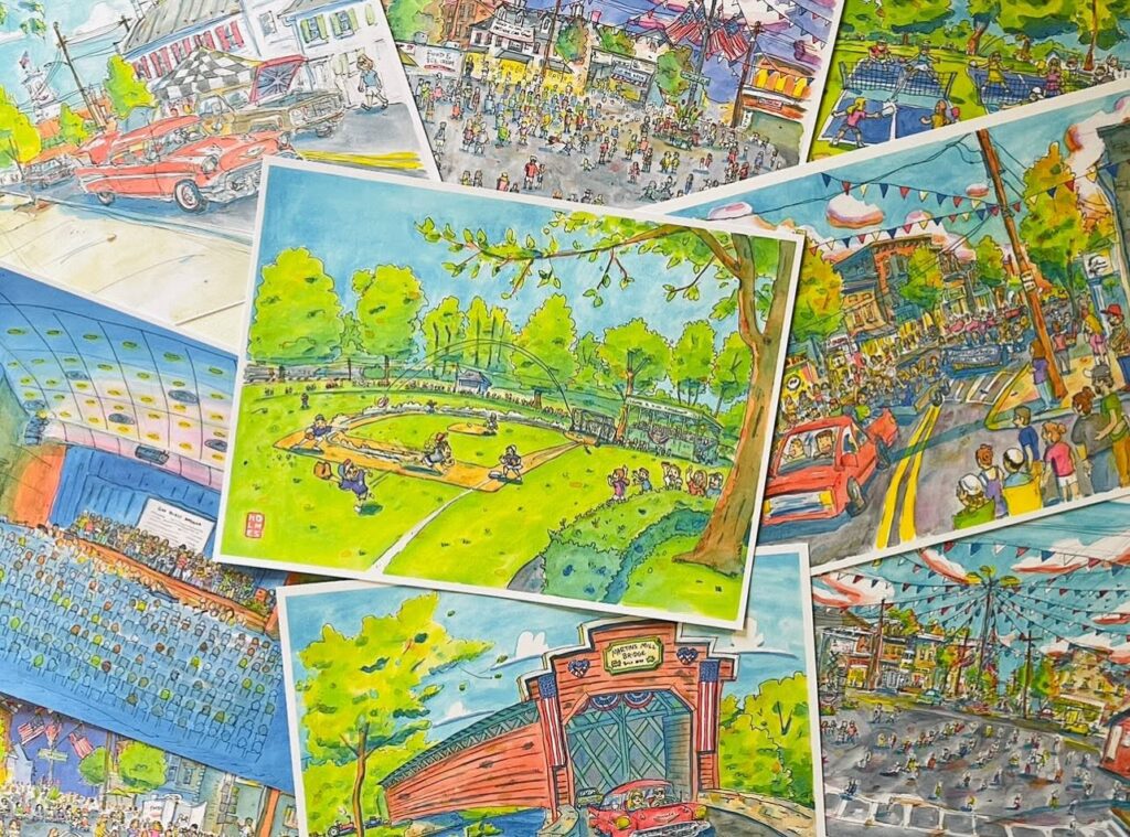 Favorite spots for Holmes include Renfrew Park and Cunningham Falls, “or any festival or event. I went to Greencastle’s Old Home Week and did one, and had people ask, ‘Are you coming back tomorrow?’ and as the week went on I did 13, with some bought on the spot.” Sketches of Market Days in Waynesboro and events in downtown Mercersburg, Chambersburg and Shippensburg also are a part of Holmes’ portfolio “and I’d like to explore the rest of Franklin County.”