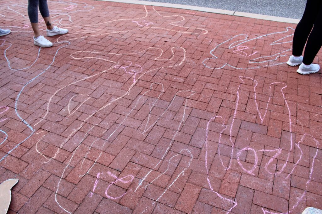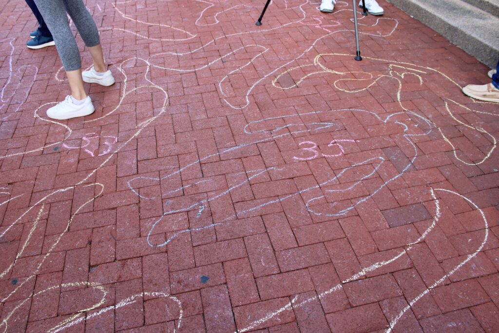 Typically, these events begin at 9 a.m., but organizers had more planned this Tuesday morning. Protestors began to show up on Washington Street — chalk in hand — around 7 that morning. Using cardboard cut outs, and the bodies of volunteers, demonstrators used chalk to outline 47 bodies, symbolizing those who have passed away in ICE custody since the Trump administration began.