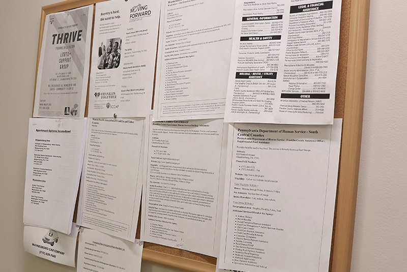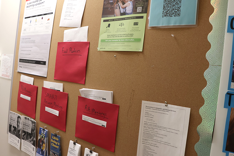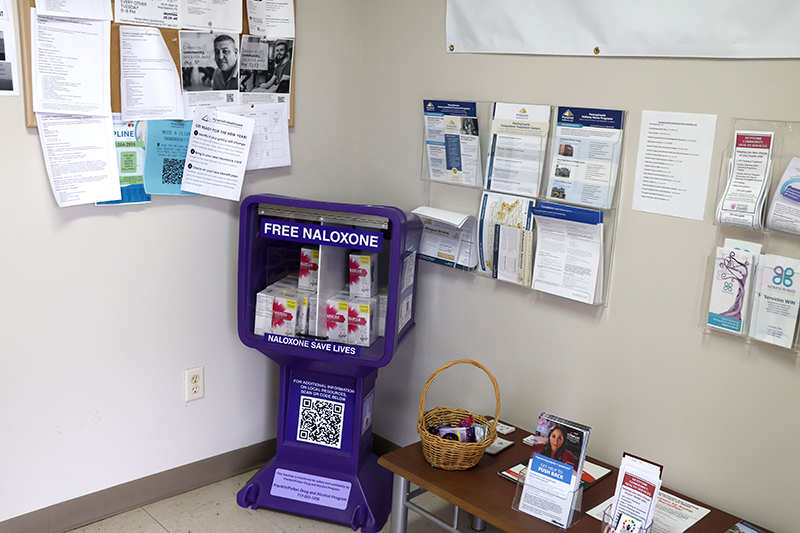 In addition to walk-in assessments for mental health and drug and alcohol treatment on Mondays and Wednesdays from 9 a.m. to 2 p.m., the facility provides access to a Narcan station and a community resource board featuring local 12-step meetings, food and housing assistance, and other support options.