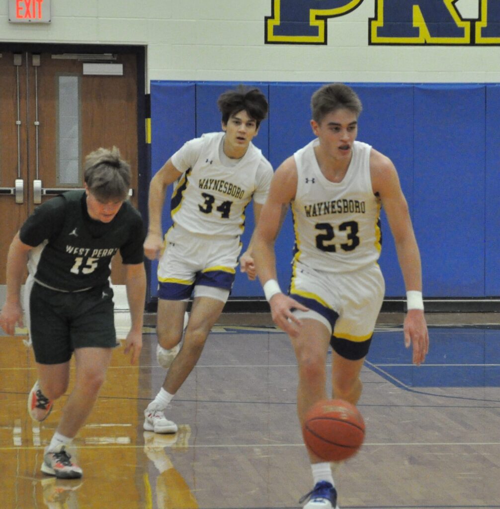 Waynesboro's Ryan Shaffer (23) dribbles down court against West Perry during the 2022-23 season.