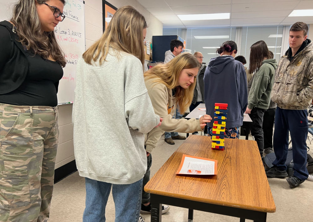 • Financial Jenga: A variation on Jenga where successfully pulling numbered wooden blocks from a stack allows student teams to gather points by answering financial questions. Rotarian Pete Holdaway and F&M volunteer Evelyn Farnsworth acted as masters of ceremony.
