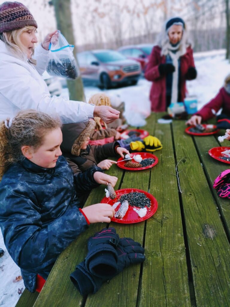 Instructor Pam Rowland helps students create pine cone bird feeders during an EXPLORE! program last winter. A new series of winter EXPLORE! programs for children are scheduled on Thursdays in February.