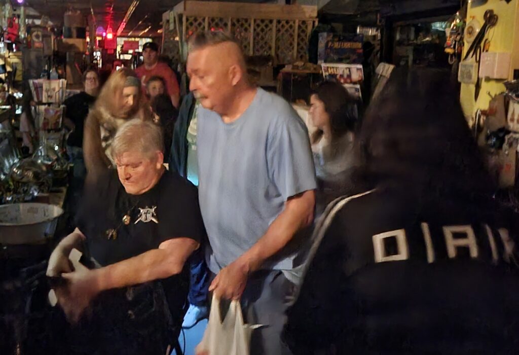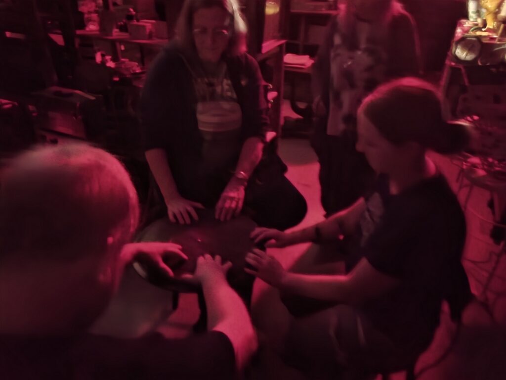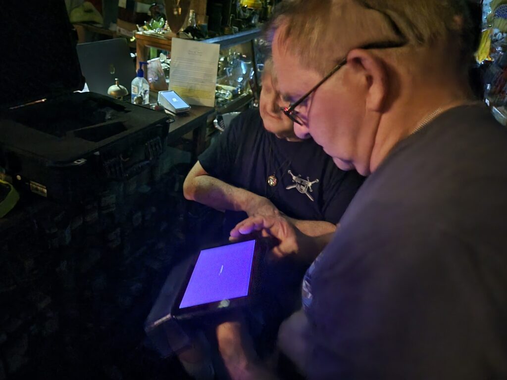 While others were investigating the store, Jim was working with visitors using his “tipping table” and “phasma-box.” The tipping table is used as a method of communication with spirits using the collective energy of the participants. This method, which dates back to the 19th century, is a popular method used by Jim and he held several sittings that night. He also used the phasma-box or “spirit box” as it is more commonly referred.