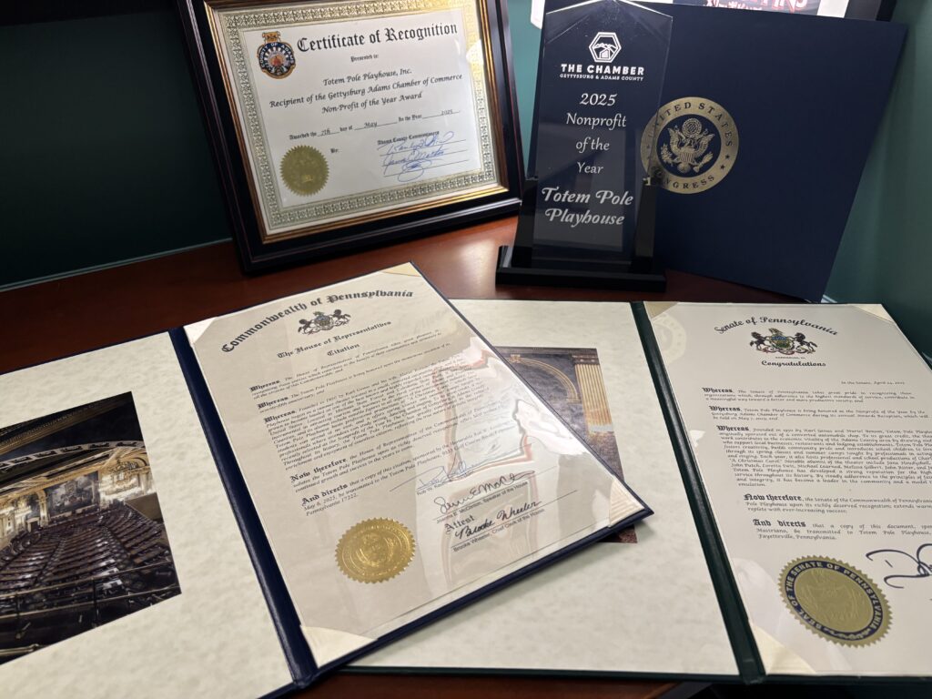 Totem Pole officials were deeply honored to be nominated and to stand alongside so many other incredible businesses making a difference in Adams County. In addition to the Chamber award, the Playhouse was recognized with a Certificate of Recognition from the Adams County Commissioner, a Citation from the Pennsylvania House of Representatives sponsored by Rep. Rob W. Kauffman (R-Franklin/Adams), a Congressional Recognition from U.S. Rep. John Joyce and Senate congratulations from state Sen. Doug Mastriano (R-Franklin/Adams)—a powerful show of support for Totem Pole’s impact on the community.